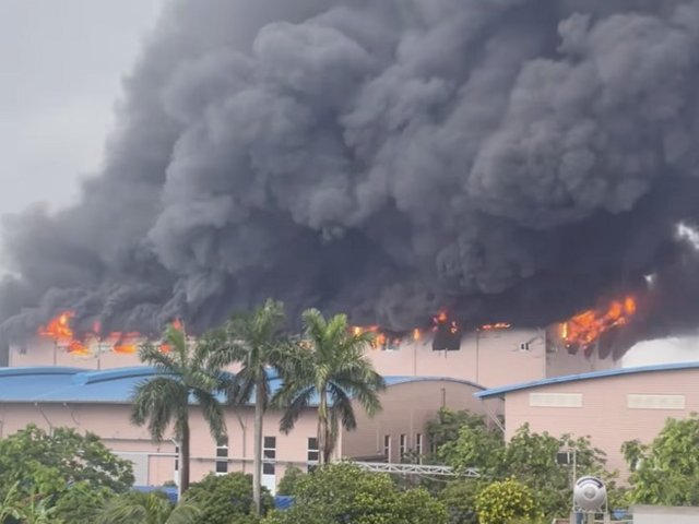 Nhà xưởng 4 tầng sản xuất giày da ở Vĩnh Phúc bốc cháy ngùn ngụt vào sáng sớm, thiêu rụi nhiều tài sản.