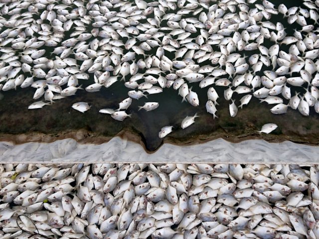 Mưa lớn và lũ về làm nguồn nước bị ngọt, hơn 1.000 lồng cá nuôi trên đầm Cầu Hai của người dân huyện Phú Lộc (Thừa Thiên Huế) chết trắng.