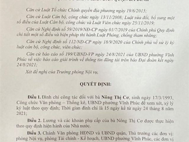 Quận Ba Đình ra quyết định đình chỉ công tác 15 ngày đối với nữ cán bộ UBND phường Vĩnh Phúc liên quan vụ chi tiền triệu để được tiêm vaccine COVID-19.