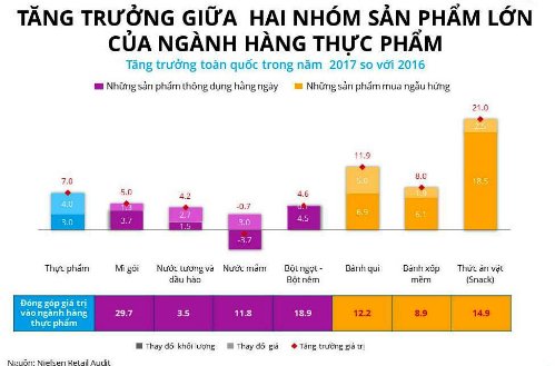 Snack (bim bim) có mức tăng trưởng 21%, mạnh nhất trong nhóm thực phẩm tại thị trường Việt Nam.