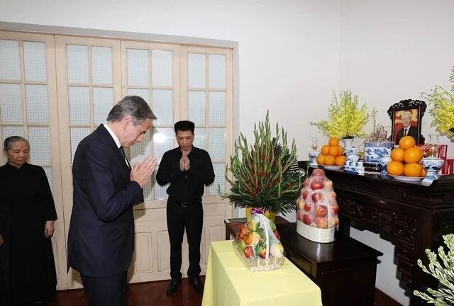 Tối 27/7, Phái đoàn đại diện Tổng thống Hoa Kỳ do Ngoại trưởng Antony Blinken dẫn đầu, đến thắp hương, chia buồn với gia đình Tổng Bí thư Nguyễn Phú Trọng.