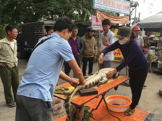 Xe tải chở hàng chục con cá sấu tập kết ở bến xe huyện Quỳ Châu (Nghệ An), từng con bị kích điện giết chết, mổ thịt công khai trước sự chứng kiến của nhiều người dân phố núi.