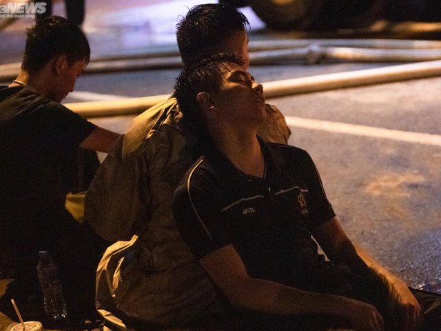 Nén nỗi đau khi phải chứng kiến đồng đội hy sinh, những chiến sĩ cảnh sát PCCC xuyên đêm dập đám cháy, làm nguội hiện trường để ngăn ngọn lửa bùng phát trở lại.