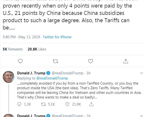 Tổng thống Mỹ Donald Trump bác bỏ tin người tiêu dùng Mỹ phải trả thuế cao hơn cho hàng nhập khẩu Trung Quốc, cảnh báo Trung Quốc không tiếp tục phản kháng.