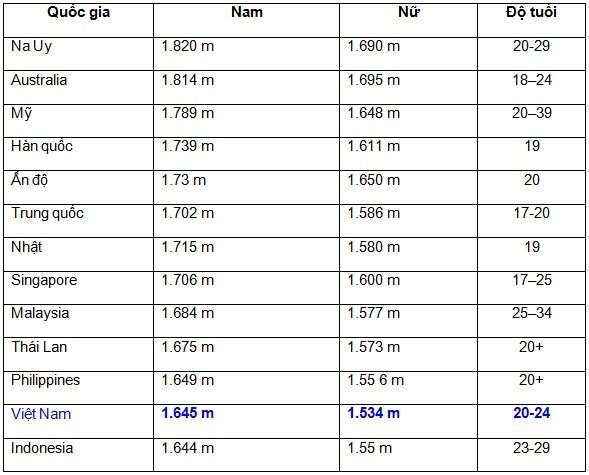 Chiều cao trung bình của thanh niên Việt Nam 164 cm ở nam, 153 cm ở nữ, thấp hơn nhiều so với người Nhật, Hàn và châu Âu.