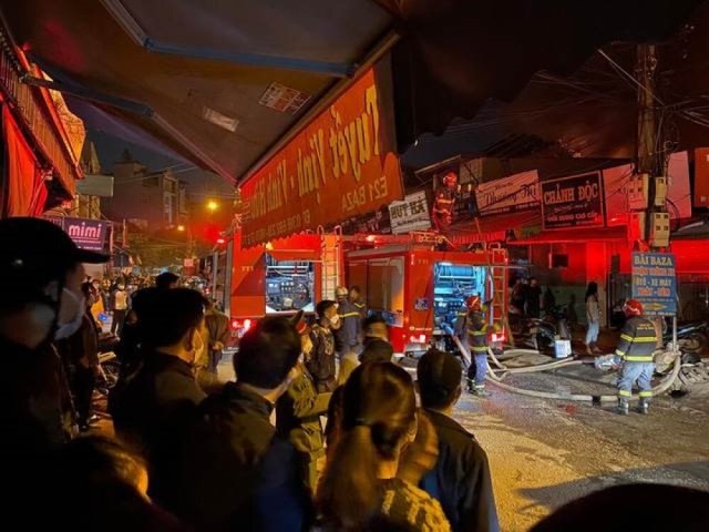 Đám cháy xuất phát từ tầng 1 ki ốt giày dép, sau đó lan lên tầng 2, hàng chục chiến sỹ cảnh được điều tới hiện trường.