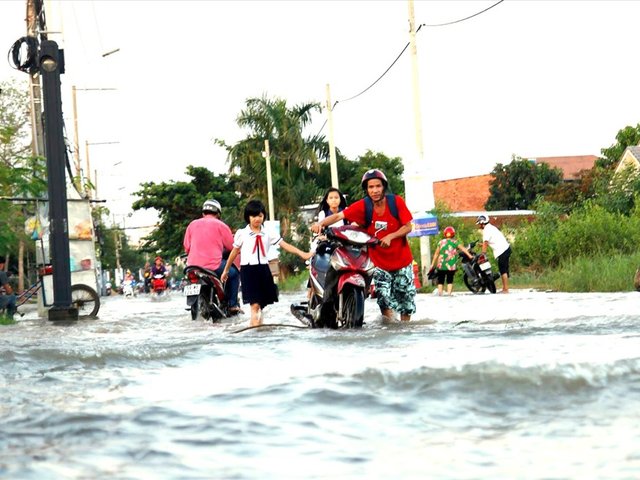 Thầy giáo khiêng xe máy băng qua nước lũ đến trường