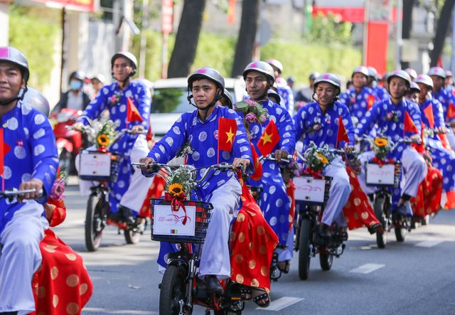 100 chú rể rước dâu bằng xe đạp điện trong ngày Quốc khánh ở Sài Gòn