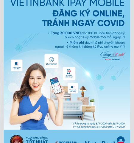 Giao dịch trực tuyến trên VietinBank iPay Mobile trong bối cảnh cách ly xã hội vì dịch Covid-19 không chỉ mang đến sự an toàn, tiện lợi mà khi đăng ký mới dịch vụ khách hàng còn nhận được 30.000 đồng vào tài khoản và miễn phí giao dịch.