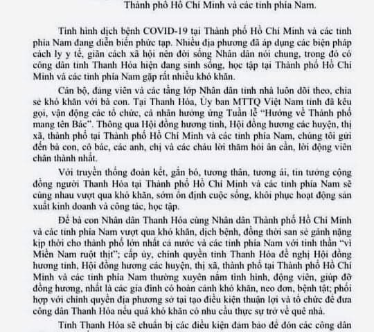 Trước diễn biến của dịch COVID-19 ở TP.HCM và các tỉnh miền Nam, lãnh đạo tỉnh Thanh Hóa gửi thư động viên chia sẻ, cho biết tỉnh sẵn sàng đón người dân trở về quê.