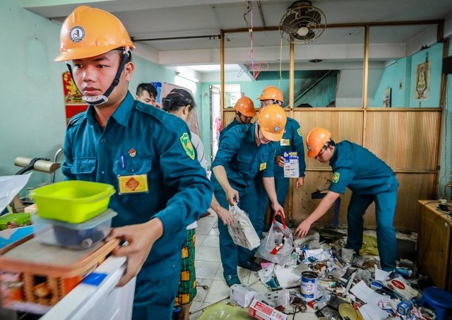 Hơn 200 người gồm công an, dân phòng, nhân viên vận chuyển nhà... đã hỗ trợ người dân trong chung cư bị nghiêng 45 cm dọn đồ đạc, di dời đến nơi ở tạm.