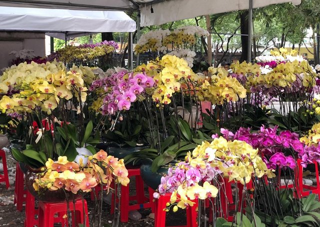 Sau khi khách lựa chọn màu sắc, thợ hoa sẽ ghép từng cành lan vào chậu, với giá 250.000-300.000 đồng/cành loại thường và 800.000 đồng loại lan nữ hoàng Nhật.