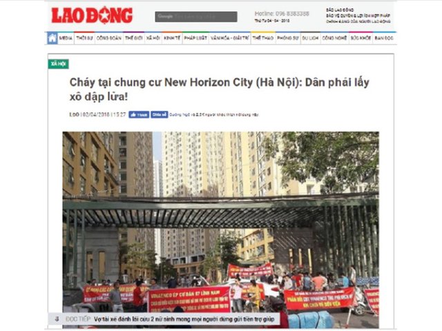 Báo Lao Động ngày 2.4 phản ánh việc cư dân ở chung cư New Horizon City (87 Lĩnh Nam, Hà Nội) luôn phải sống trong sợ hãi: Có cháy nhưng chuông báo cháy không hoạt động, người dân phải nghe tiếng cứu hỏa mới biết có cháy. Bi hài hơn lại có chuyện chuông báo cháy bất thường hoạt động khi không có sự cố khiến cư dân vô cùng bất an, sống trong lo sợ. Sau phản ánh của báo Lao Động, hôm nay (5.4), Sở Cảnh sát PCCC của Hà Nội sẽ trực tiếp xuống kiểm tra.
