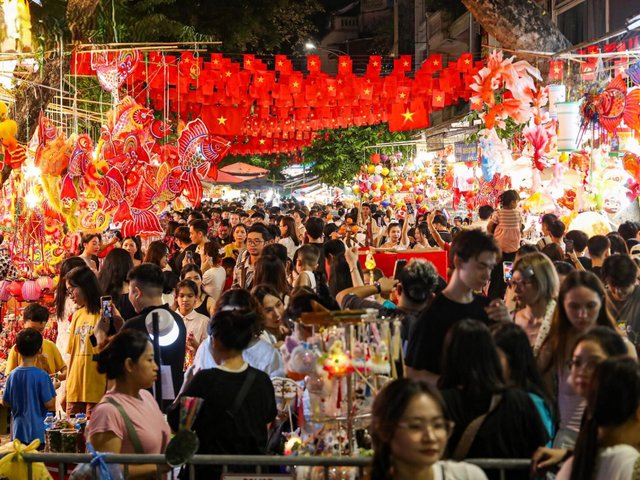 Tối 4/10, hàng nghìn người đổ về phố Hàng Mã (Hà Nội) vui chơi, chụp ảnh cùng đón Trung thu sớm.