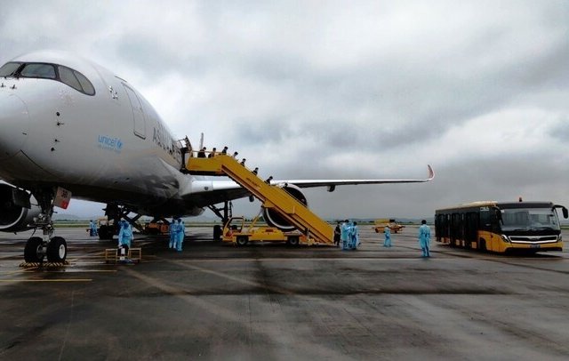 Chuyến bay OZ7737 chở 308 kỹ sư người Hàn Quốc hạ cánh xuống sân bay Vân Đồn, trưa 17/4.