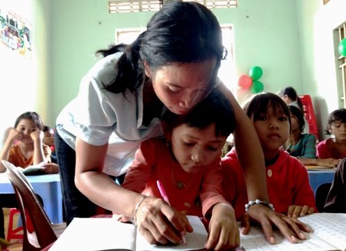 Thương những đứa trẻ J'rai không có điều kiện học tập, cô Rmah H’Blao (Gia Lai) miệt mài đứng lớp trên đôi chân tật nguyền, co quắp.