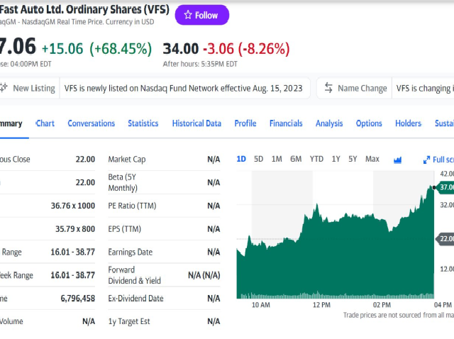 Kết thúc phiên giao dịch đầu tiên trên sàn chứng khoán Mỹ, cổ phiếu VFS của VinFast ở mức 37,06 USD/cp, giá trị vốn hóa của hãng đạt 85,5 tỷ USD.