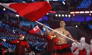 Vận động viên Tonga cởi trần mang cờ diễu hành trong lễ khai mạc Olympic