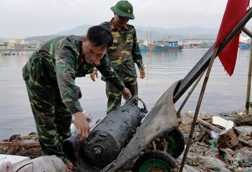 Đơn vị rà phá bom mìn phát hiện ngư lôi dài một mét, đường kính 30 cm ở Quảng Ngãi khi chuẩn bị mặt bằng cho công trình đê biển.