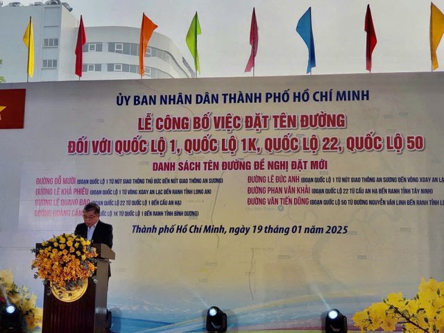 Sáng 19/1, UBND TP Hồ Chí Minh tổ chức lễ công bố việc đặt tên đường gồm: Quốc lộ 1, Quốc lộ 1K, Quốc lộ 22 và Quốc lộ 50. Quyết định đã được HĐND TP Hồ Chí Minh thông qua tại kỳ họp tháng 12/2024.