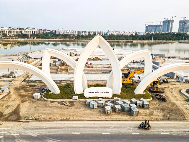 Sau 3 lần lỡ hẹn tiến độ, công viên Gia Lâm (Hà Nội) với vốn đầu tư hơn 280 tỷ đồng đang dần hoàn thiện, nổi bật với cổng hoa sen 5 cánh và nhiều hạng mục cảnh quan.