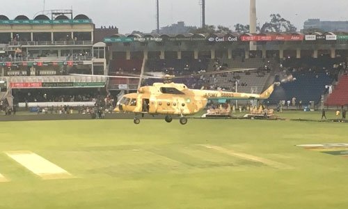Trực thăng quân sự Pakistan bay lơ lửng trên một sân vận động để dùng cánh quạt làm khô mặt cỏ trong giải vô địch cricket quốc gia.