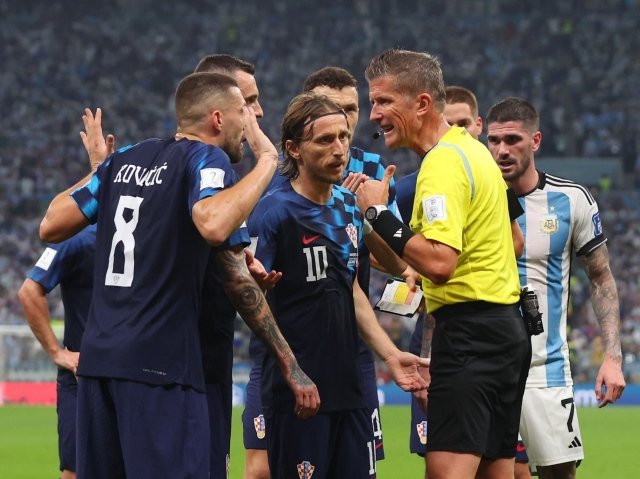 Luka Modric và đồng đội bức xúc khi đội tuyển Argentina được hưởng một quả phạt đền gây tranh cãi.