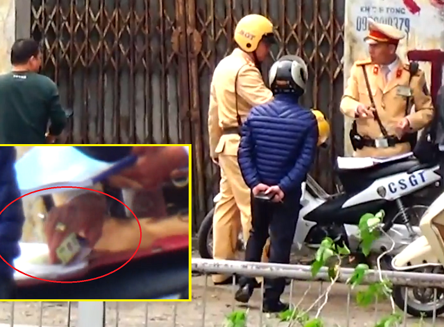 Không cần xuất trình giấy tờ, CSGT luồn tay khéo léo xuống tập hồ sơ rút nhanh tờ 200 nghìn đồng đút vào túi, rồi ra hiệu cho nam thanh niên đi.