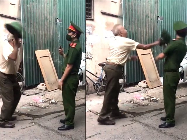 Bị nhắc nhở vì không đeo khẩu trang khi đi ra ngoài đường, cụ ông cự cãi rồi bất ngờ dùng mũ cối vụt thẳng vào mặt cán bộ công an ở Hà Nội.