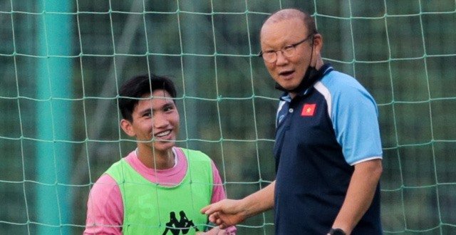 Huấn luyện viên Park Hang-seo gặp lại Đoàn Văn Hậu trên sân tập của U22 Việt Nam và bất ngờ về thể hình của cậu học trò.