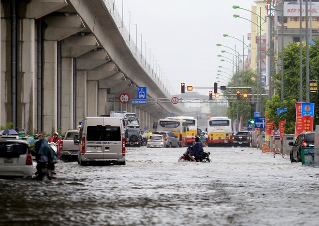 Mưa lớn từ đêm qua đến sáng nay khiến hàng loạt con phố ở Hà Nội ngập, có chỗ sâu đến nửa mét.