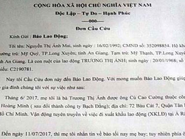 Sau loạt bài đăng trên báo Lao Động, thi hài bà Trần Thị Bình (sinh năm 1963, xã Hưng Lộc, TP.Vinh, Nghệ An) mang tên giả là Vương Thị Hoài Thu (sinh năm 1977, xã Nghi Xuân, huyện Nghi Lộc, Nghệ An) đi xuất khẩu lao động tại Saudi Arabia rồi tử vong đã được Cty đưa về nước sau gần 1 năm phải nằm ở nhà lạnh xứ người. Trong khi những sai phạm của doanh nghiệp, cá nhân liên quan trong vụ này chưa được các cơ quan chức năng làm rõ thì đêm 24.3, phóng viên Báo Lao Động lại nhận được lời kêu cứu từ con gái của một lao động bị tử vong tại Saudi Arabia, nửa năm chưa đưa được thi hài về nước.