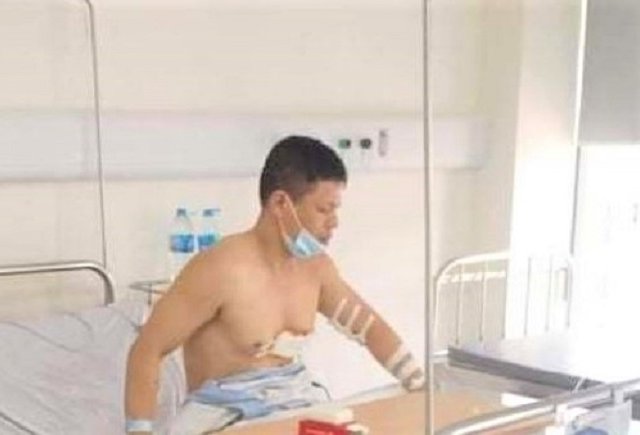Tài xế taxi Nguyễn Trần Minh kể lại tên cướp ngồi sau xe rút một con dao chọc tiết lợn đâm trúng ngực anh, sau đó cả 2 vật lộn, giằng co trong xe.