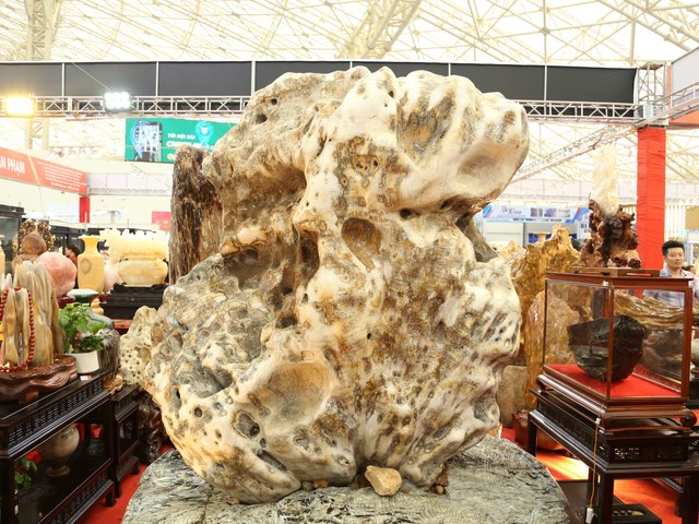 Một gian hàng trong khu đá quý tại Hội chợ mùa Thu lần thứ nhất - 2025 đang trưng bày các loại san hô, gỗ hóa thạch niên đại hàng trăm triệu năm, giá tiền tỷ.