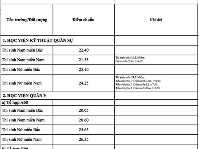 Điểm trúng tuyển vào 18 trường quân đội