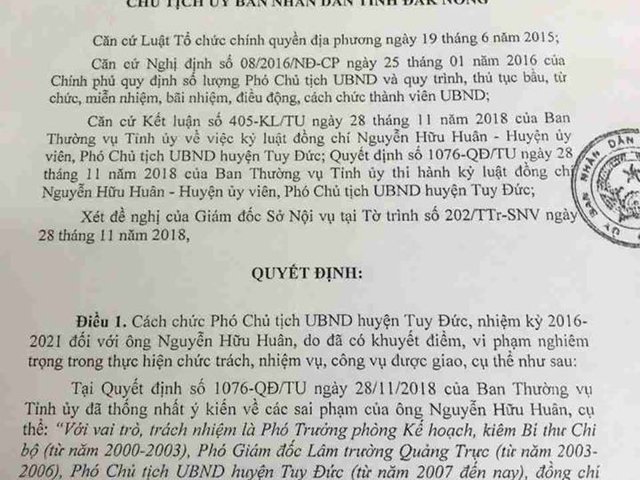 Chủ tịch tỉnh Đắk Nông vừa ký quyết định cách chức ông Nguyễn Hữu Huân Phó chủ tịch huyện Tuy Đức nhiệm kỳ 2016-2021 do dính đến nhiều sai phạm trong lĩnh vực đất đai.
