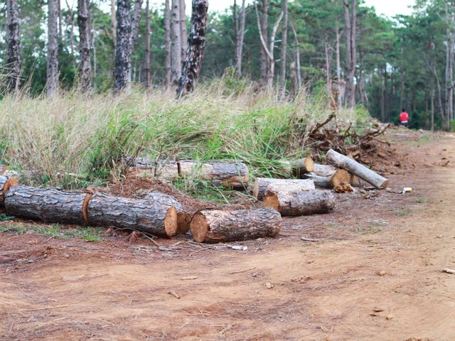 Lợi dụng việc cắt dọn, khai thác tận thu những cây thông bị chết, gãy mục, bị ken tại rừng Cộng đồng bon Bu Koh (tiểu khu 1491, xã Đắk R’tíh, huyện Tuy Đức), một số đối tượng đã cưa hạ, chặt phá trái phép hàng trăm cây thông còn tươi xanh để bán gỗ.
