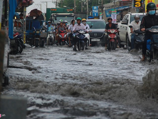 Triều cường ở TP.HCM dâng cao, người dân ngã nhào trên đường vì ngập