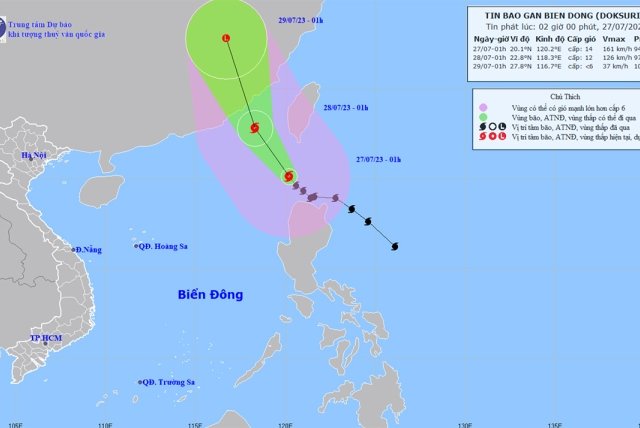 Cơ quan khí tượng cho biết, lúc 1h ngày 27/7, sức gió mạnh nhất vùng gần tâm bão Doksuri mạnh cấp 14 vị trí tâm bão trên vùng biển phía Tây Bắc đảo Luzon.