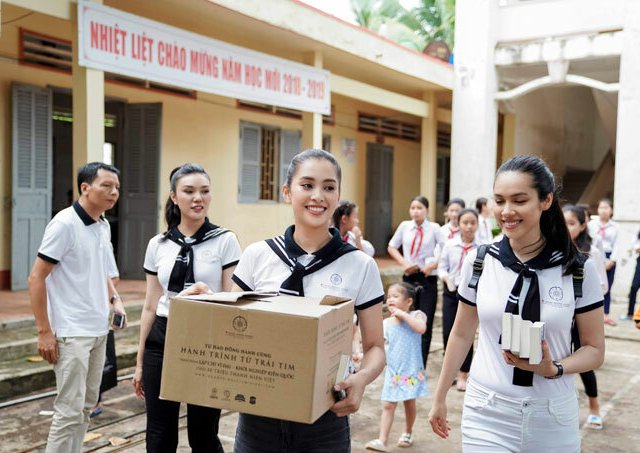 Sau 2 ngày đêm lênh đênh trên tàu, rẽ sóng vượt hàng trăm hải lý, ngày 28.6, Hoa hậu Tiểu Vy, Á hậu Hoàng My, người đẹp Giao Linh đã tới với các chiến sĩ, thanh niên, học sinh, quân và dân đảo Thổ Chu (Kiên Giang).
