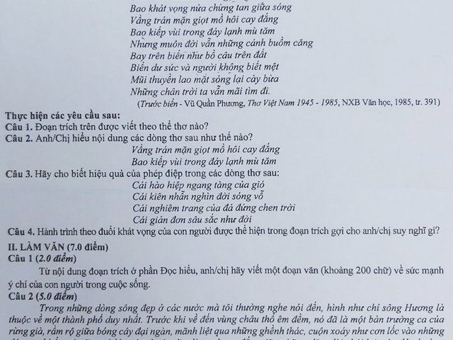 Đề gồm hai phần đọc hiểu và làm văn, trong đó câu nghị luận văn học hỏi về tác phẩm "Ai đã đặt tên cho dòng sông" chiếm 5 điểm.
