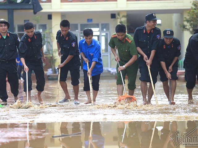 - Nước lũ rút, từ sáng sớm, hơn 100 chiến sĩ cảnh sát cơ động và phòng cháy chữa cháy phun nước, tất bật dọn dẹp vệ sinh khắp ngõ xóm cùng người dân.