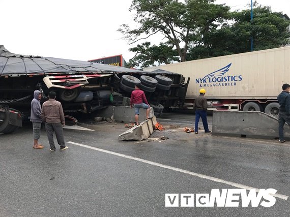 Tránh xe máy, một xe container húc bay dải phân cách và lao sang làn bên kia đè bẹp xe bán tải chạy ngược chiều.