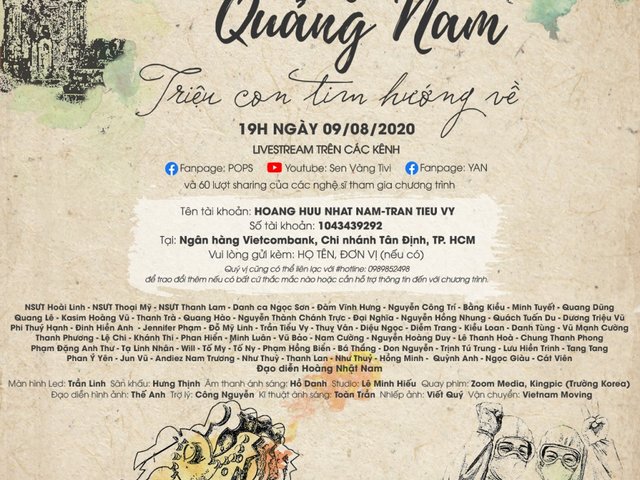 Góp mặt trong đêm nhạc trực tuyến sẽ có nhiều tiết mục đặc sắc của gần 60 nghệ sĩ đến từ nhiều lĩnh vực khác nhau. Các khách mời không chỉ biểu diễn mà còn trò chuyện, chia sẻ những kỷ niệm về Đà Nẵng, Quảng Nam và đưa ra các hiện vật để bán đấu giá.