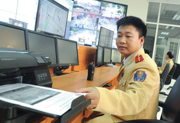 Từ trung tâm điều khiển giao thông (Phòng CSGT TP Hà Nội), qua camera giám sát, những người điều khiển có thể biết rõ từng điểm ùn tắc và cử người đến điều tiết, phân luồng.