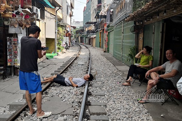 Sáng 10/10 cơ quan chức năng đã lập rào cấm toàn bộ du khách đến cà phê phố đường tàu Phùng Hưng. Các quán đóng cửa, chủ quán rảnh rỗi nằm selfie trên đường tàu