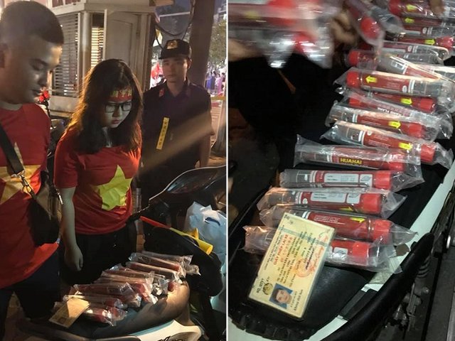 Mang pháo sáng ra đường ăn mừng đội tuyển Việt Nam đánh bại Philippines, đôi nam nữ bị lực lượng 141 chặn giữ cùng hàng chục quả pháo.