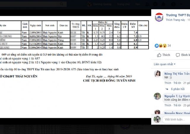 Trường THPT Đại Từ có điểm chuẩn vào lớp 10 chỉ 5,9 điểm 3 môn và một số thí sinh có môn thi chỉ đạt 0,25 0,5 hay 0,75 điểm vẫn trúng tuyển vào trường.