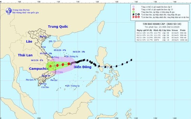 Vào khoảng 19h ngày mai (5/11), bão số 10 sẽ đi vào vùng biển từ Quảng Ngãi đến Khánh Hòa.