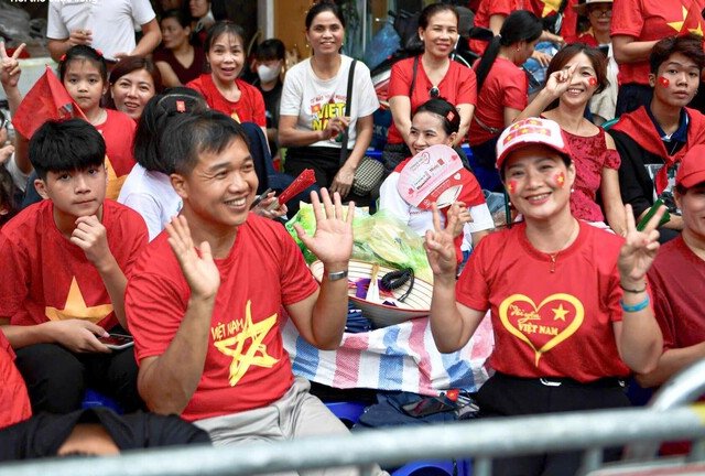 Hàng vạn người trong sắc áo cờ đỏ sao vàng, vẫy cờ Tổ quốc cùng hát vang các ca khúc cách mạng tạo nên bầu không khí sôi động trước giờ tổng hợp luyện A80 lần hai.
